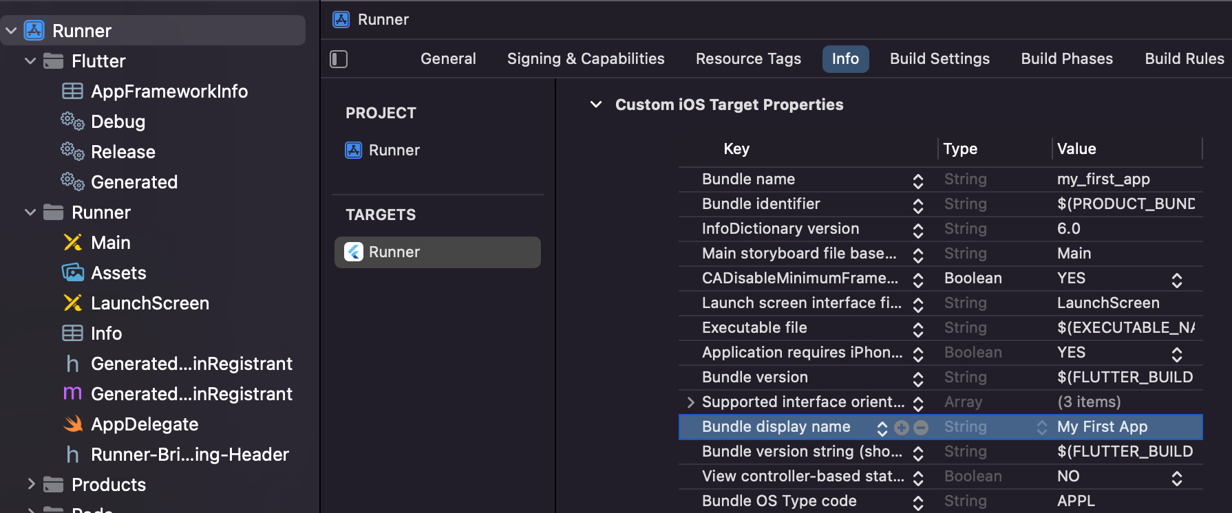 Info, find theBundle display namekey and update its value to your desire name (e.g. My First App). This is the name that shows up once your App has been installed. This doesn’t have to exactly match your App Name, and can be shorter so its name is not cut off under the App icon.